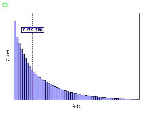 図AはMSY理論でおなじみの個体数と増加率の関係を示したもの。そして図①は、図Aの右端、満限状態にあるときのポピュレーション(人口/個体数動態)曲線です。以下、図A中の②~⑤の段階にあるポピュレーション曲線のグラフはそれぞれ下段に示します。