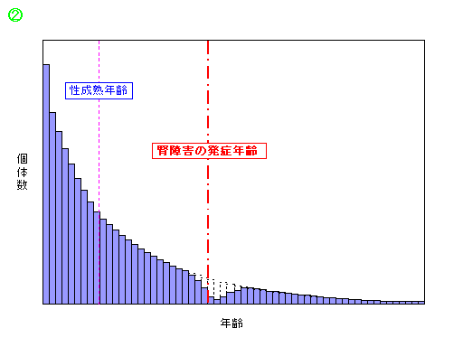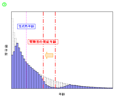 摂餌率増加によってカドミウムの体内蓄積が進み、閾値を越える年齢付近で腎障害が発症するようになります。それによって、ある年級群以降になると、腎障害の平均発症年齢付近を境に死亡率が急激に上昇します。これは、メスの繁殖可能期間を大幅に短縮させ、新生児加入率を減少させます。
