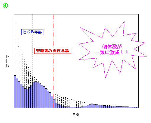図③では、カドミウムの生体濃縮のペースが速まることで腎障害の発症年齢がさらに低年齢化し、加えて新生児の加入率低下がポピュレーションに反映され始めます。この時点では〝見かけの増加率〟に大きな変化は見られません。調査捕鯨では捕獲した全個体で調べられるのは耳垢栓の年齢査定のみで、生体中の汚染物質の濃度などは一握りのサンプルでしか行われません。想定される発症年齢以降の個体の腎機能・肝機能値の継続的で慎重なモニタリングを行わない限り、将来のポピュレーションへの影響は見過ごされかねないのです。その結果が図④です。