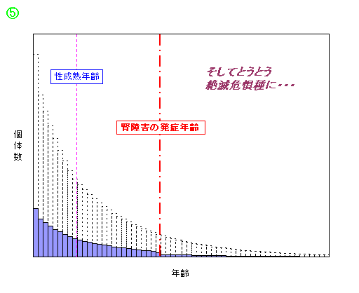 この段階で、クロミンククジラはあたかも突然の大災害に見舞われたかのように、大幅な個体数の減少を示します。しかし、初期に腎障害が現れた年級群の子供の世代が成熟して捕獲対象になるまで、人間は目立った異変に気づかないでしょう。しかも、ある範囲の年齢層の〝見かけの増加率〟だけ見れば、あたかも資源が頑健であるかのように映ってしまうのです。