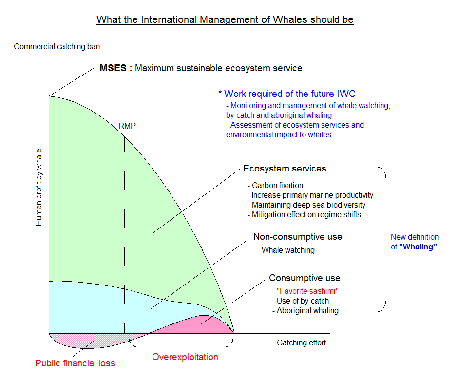 Comprehensive management including consumptive use, non-consumptive use, and whole ecological services is the most rational management of whales as "Global Commons" at the international governmental organization.
