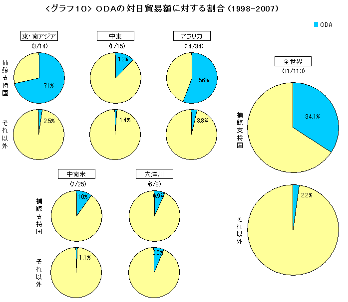 <グラフ8>と<グラフ9>からも予想できることだが、捕鯨支持国とそれ以外の国との間で際立った違いが表れた。全世界では15.5倍、アフリカで14.5倍、最も開きのある東・南アジアでは約28倍も捕鯨支持国向けのODAの方が比率が高い。輸出と輸入を半々と仮定した場合、東アジアとアフリカの捕鯨支持国では、日本政府から送られる援助金額の方が年間の輸入額を上回っていることになる。全世界で見ても、捕鯨支持国では日本のODAが対日輸入の3分の2に匹敵する計算だ。