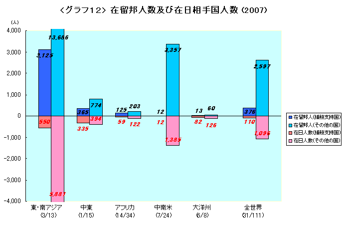 <グラフ11>は、日本から現地へ進出した企業、<グラフ12>は、現地に在留する日本人の数及び日本に在住する相手国人の数について、地域毎に1カ国当りの平均の数値を示したグラフである。データは2007年のもの。棒グラフの左側が捕鯨支持国、右側がそれ以外の国。数字の差が大きくなりすぎるため、<グラフ11>では中国とタイ、<グラフ12>では中国・フィリピン・ブラジルを除外してある。