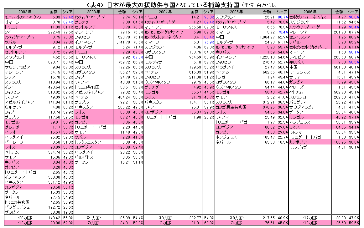 この表の中で、どれが捕鯨支持国(2008年時点)かを、わかりやすいようピンク色で着色したのが<表4>である。
