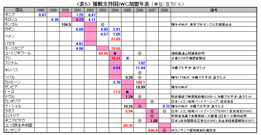 <表5>は、2000年以降相次いで加盟した捕鯨支持国の加盟年と、その前後2年間に供与された特筆すべき援助及び外交上のイベントを年表の形にしたものである。ピンクのセルが当該国のIWC加盟年。黒字はODA全体、青字は水産ODA、赤字は債務救済。水産ODAについては暦年でなく会計年度である。2008年のマーシャルへの水産ODAは、DACレートが公表されていないので前年のレートに基づきドルに換算した。◎は外交トピック、★については後述する。
