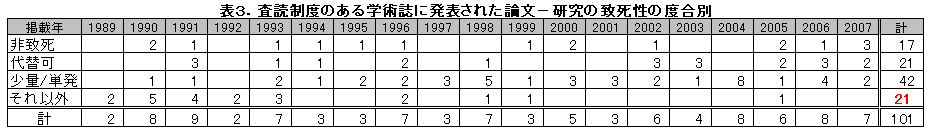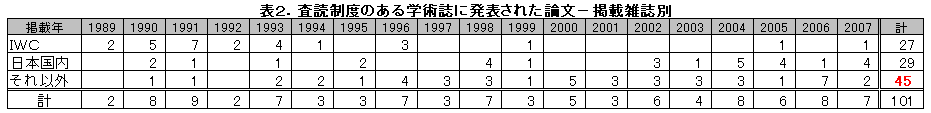 表2は、掲載誌(一部雑誌の体裁でないものも含まれる)が①IWCのレポート、②日本の科学誌、③それ以外の科学誌に分けたもの。②の日本の科学誌というのは、読んで字の如く発行元が日本国内の学会等のもの、言い換えればローカルな雑誌ということになります。専門の学術論文掲載誌ですから、雑誌タイトルまで基本的に英文ですが、中には論文自体が日本語で書かれているものも入っているようです。南極海での調査に関する論文の発表の場としては、あまり相応しいとはいえないでしょう。実際、それらの科学誌に掲載されている他の論文の多くは、国内の動物を対象に国内で行われた研究が中心です。①IWCのレポートに掲載されるのはいわば当たり前の話です。ここでハネられるようなら「International Cetacean Research」の看板は即下ろさざるを得ないでしょう。ですから、本当の意味で、内輪のみの評価でない国際水準の研究と(一応)いえるのは、それ以外の雑誌に掲載されたものということになります。表を見る限りでは、該当する論文は全体の半数に満たないことがわかります。水産庁の担当者が「科学性は半分程度」というのも、この辺りからきているのでしょう。