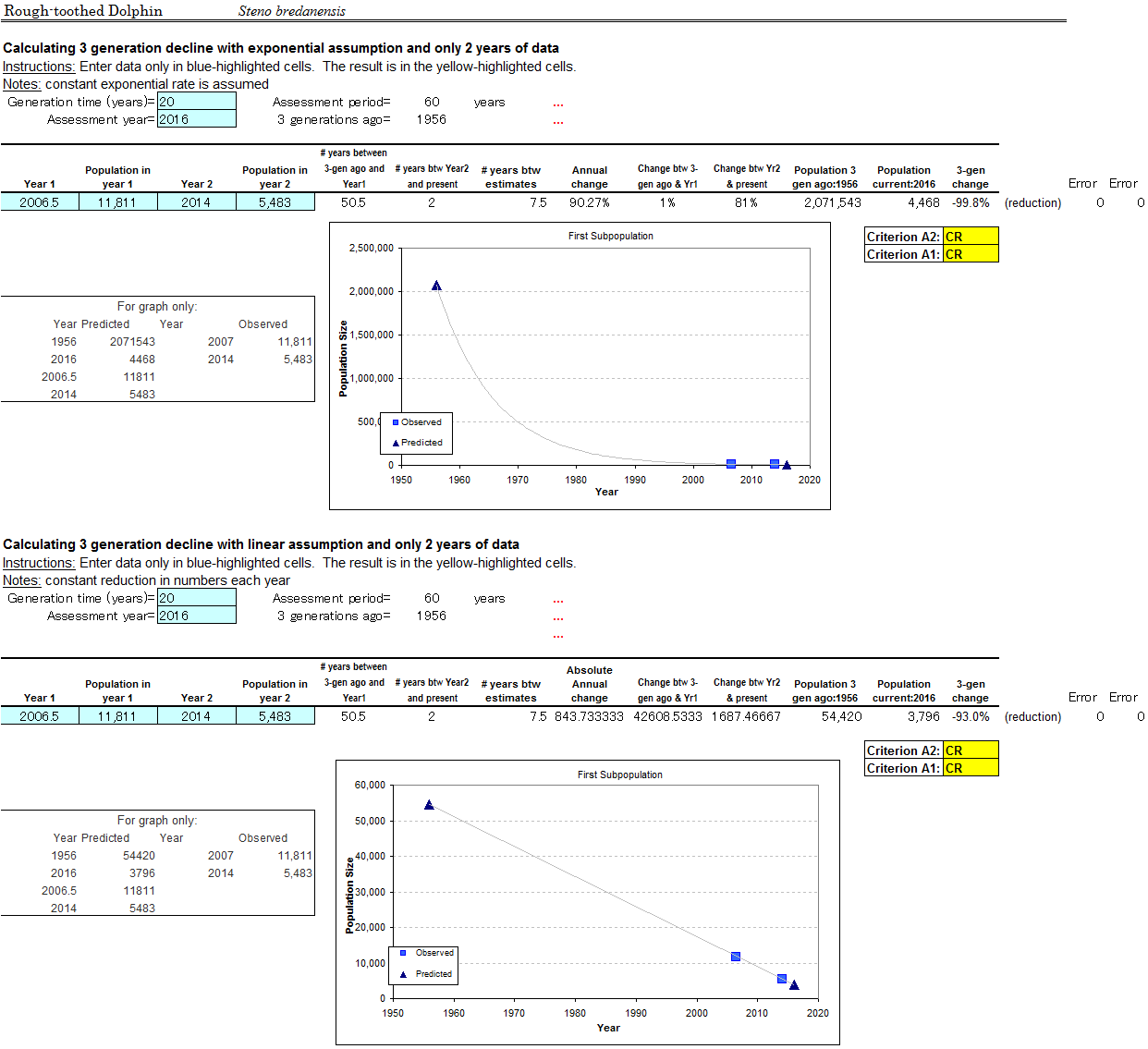 IUCNレッドリストの予防原則の趣旨に則り、ガイドラインに基づき近縁種の世代時間を外挿して基準Aによるカテゴリー判定を行ったところ、線形・指数両パターンで基準A1,2ともCR(絶滅危惧種Ⅱ類)ランクに該当する結果となった。