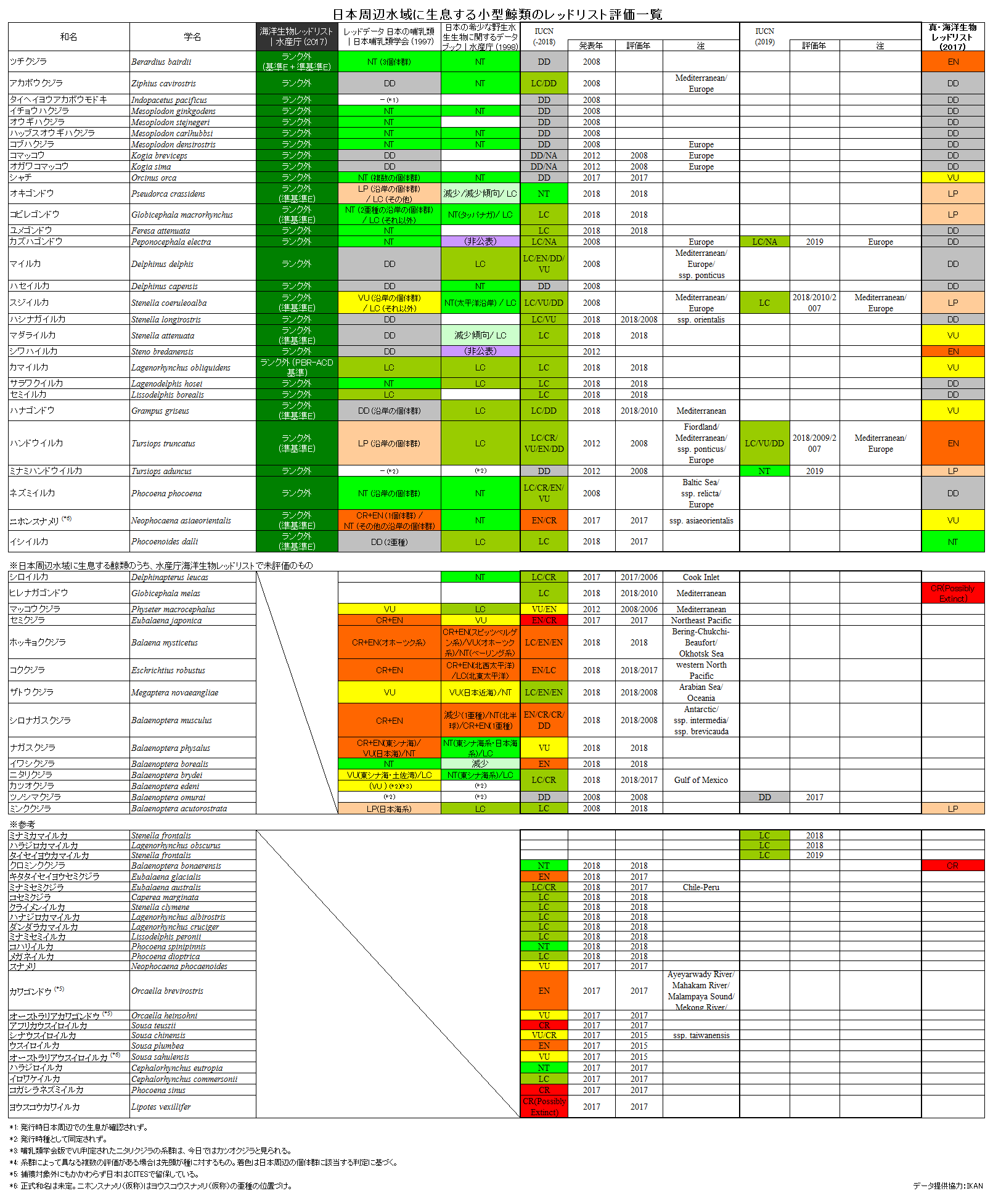 日本周辺水域に生息する小型鯨類のレッドリスト評価一覧