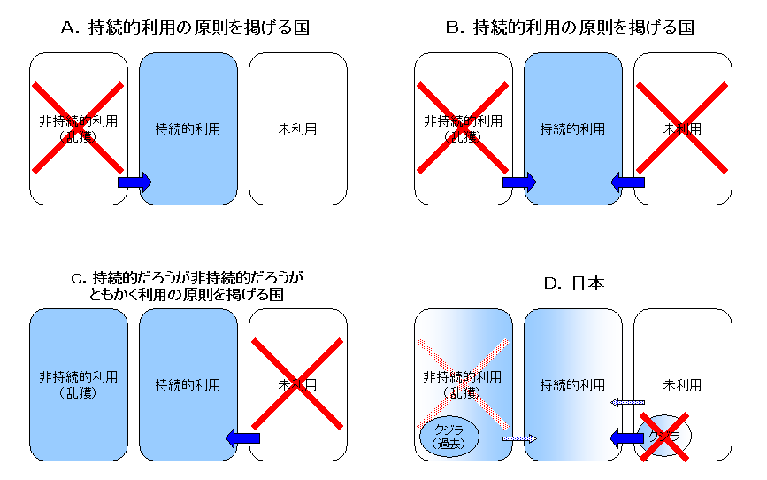 一方、Cは利用の仕方が持続的か否かを問わない、ただの水産資源/野生動物〝利用原理主義〟。言い換えれば、「持続的利用」の看板を掲げる資格のない国です。