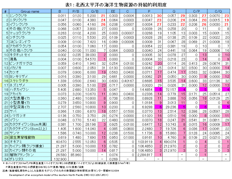 表1の左側は一次ソースからの引用、右半分は筆者がそれをもとに算出した値です。Pは再生産量。この数字が高いものほど、資源に与える影響を抑えながら漁獲できる生産量が高いことを意味します。Qは摂餌量。〝食害量〟に直結する数字といえます(食害論が正しいという前提ですが)。厳密にはもちろん、餌生物構成をもとに捕食対象のうち漁獲対象種が占める割合がどのくらいかで判断するべきことです。胃内容物調査は、PとQをもとに対象種を選ぶのがスジというものでしょう。C/P、C/Qは再生産量と摂餌量(食害)に対する〝開発度〟を表します。数字が低いものほど、再生産量、あるいは食害の影響が大きい割に、十分に利用されていないということを意味しています。国民の税金をもとにした研究費、補助金は、合理的・効率的に運用されなければなりません。ポテンシャルがあるにも関わらず、開発が遅れている分野に対してこそ投じられるべきでしょう。