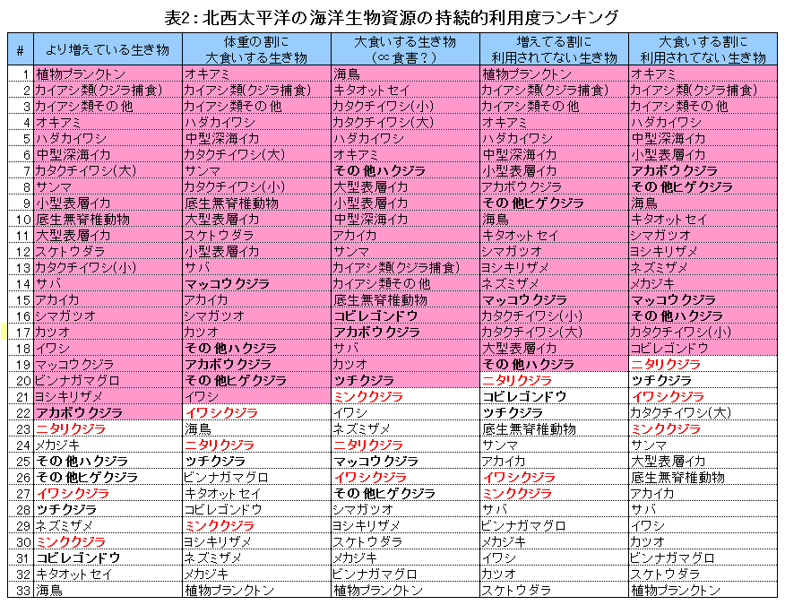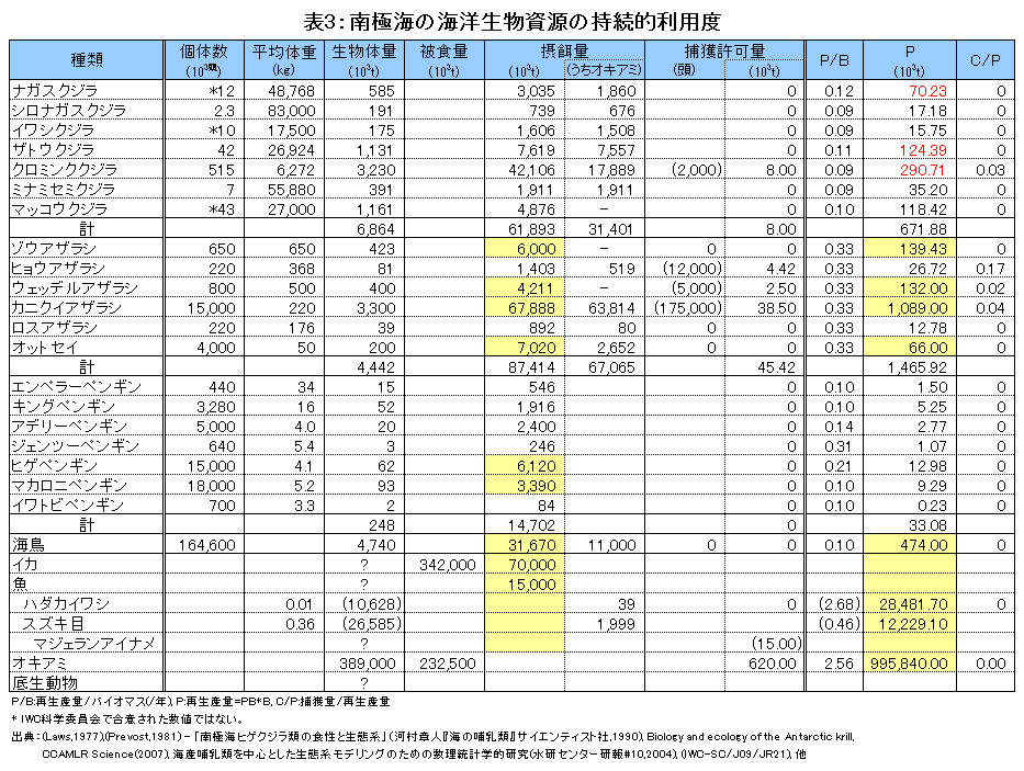 続いて、表3は同じく持続的利用度ランキング南極海版。ベースは1990年発行の『海の哺乳類』の河村氏の論説ですが、個体数は直近のものを採用。ナガスクジラ、イワシクジラ、マッコウクジラについては、現在IWCで合意されている数字はありません。ペンギンの数字は本来海鳥に含まれるものですが、ソースが違うので別個に分けて考えてください。捕獲許可量は、クジラについてはRMPの仮試算の数字、鰭脚類はアザラシ条約の許容量、マジェランアイナメとナンキョクオキアミはCCAMLRの制限量(海区合計)。オキアミのバイオマスやイカの被食量は大ざっぱな推測ですし、CCAMLRで管理されているはずのマジェランアイナメやライギョダマシも含め、他の生物群の資源量に関しては有用な情報がありません。