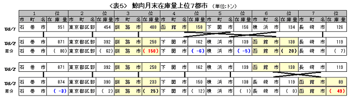 はたして、この5月の在庫上位都市を見ると、今まで名前がリストに挙がってきたことのない船橋市が唐突に3位にランクインしている。在庫量は318トン。以後9月まで、同市の在庫の値にはほとんど変化がない。なお、船橋市は今年のJARPAⅡの一次搬入先となった東京に程近い海浜都市であり、市内には元捕鯨会社(旧名:日東捕鯨)で現在は水産食品会社であるデルマール株式会社など、複数の水産・食品関連企業の工場や倉庫がある。