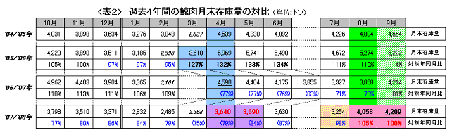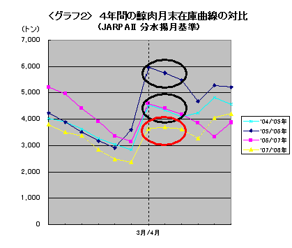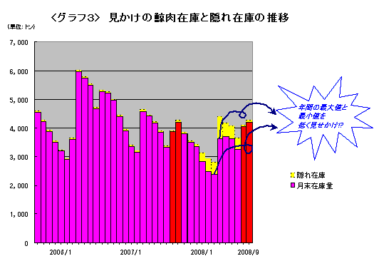 しかし、その後奇妙な現象が起こる。予兆は7月にあった。JARPNⅡ分入荷前の谷の部分で、在庫量は不意に前年度比98%に迫る。そして、前章<グラフ1>にも示したとおり、なんとこの8月のタイミングで在庫が4058トンと4千トンの大台に乗り、前年度比も105%と上回ってしまったのである。9月にはそれがさらに4209トンにまで増え、今年度の在庫量の最大値を更新した。年に2つのピークの値を比較すると、増産を開始した2006年以降、JARPAⅡ分入荷月の4月の方が勝っていたのが、今年は9月の在庫量に抜かれたことになる。8月9月の両月はJARPNⅡ生産鯨肉が水揚される月にあたるが、2008年のJARPNⅡの生産量も前年とほとんど変わらない。JARPAⅡと同様に若干下回っているほどである。つまり、これは少なくとも「生産増がもたらした在庫増」ではない。