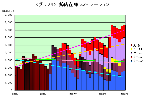 <グラフ4>は、2005年以降の鯨肉在庫曲線のごく簡単なシミュレーションである。“隠し在庫”を表に晒したケースAが基準。ケースBでは2007年の火災事故と2008年の妨害活動による影響がなく、計画どおり(2006年と同水準)の捕獲を行っていた場合。ケースCでは、さらにそのうえ鯨食ラボによる各年7月の出庫量の異常なピークを取り除いた場合である。事故と妨害と採算度外視の売り込みキャンペーンがなかったら、来年には在庫が1万トンを突破していただろう。それも把握できない“隠し在庫”を除いて。一方、ケースDは、増産をしなかった場合。漸減傾向だが、在庫の適正水準から考えればまだまだ余裕があり、一部の愛好家たちが怒りだすほど需給が逼迫する事態には当分至らないはずである。