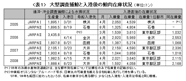生産中止にあたって、自社及び関連会社の倉庫に保持していた鯨肉製品の在庫も早々に手放されたはずである。翌年の1月、2月には、入庫量の方も前年の2倍以上に達しており、大規模な倉庫間移動があったものと考えられる。この年JARPAⅡ(南極海)の飛躍的な増産のために膨れ上がった鯨肉在庫の解消に一役買ったのは、実はこれらの水産企業に圧力をかけた、グリーンピースなど国際環境NGOだったのかもしれない。
