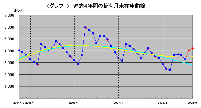 <グラフ1>を大まかに眺めてみると、生産量の増加に応じる形で、2005年から2006年にかけては在庫も増加し、その後2007年、2008年の前半と、徐々に下がってきているような印象を受ける。2006年から2007年にかけては生産量も減少したが、2007年と2008年の間では、生産量に大きな差はない。これは、捕鯨協会が主張するように、増産した分も消化できるほど鯨肉需要が拡大したことを意味するのであろうか?